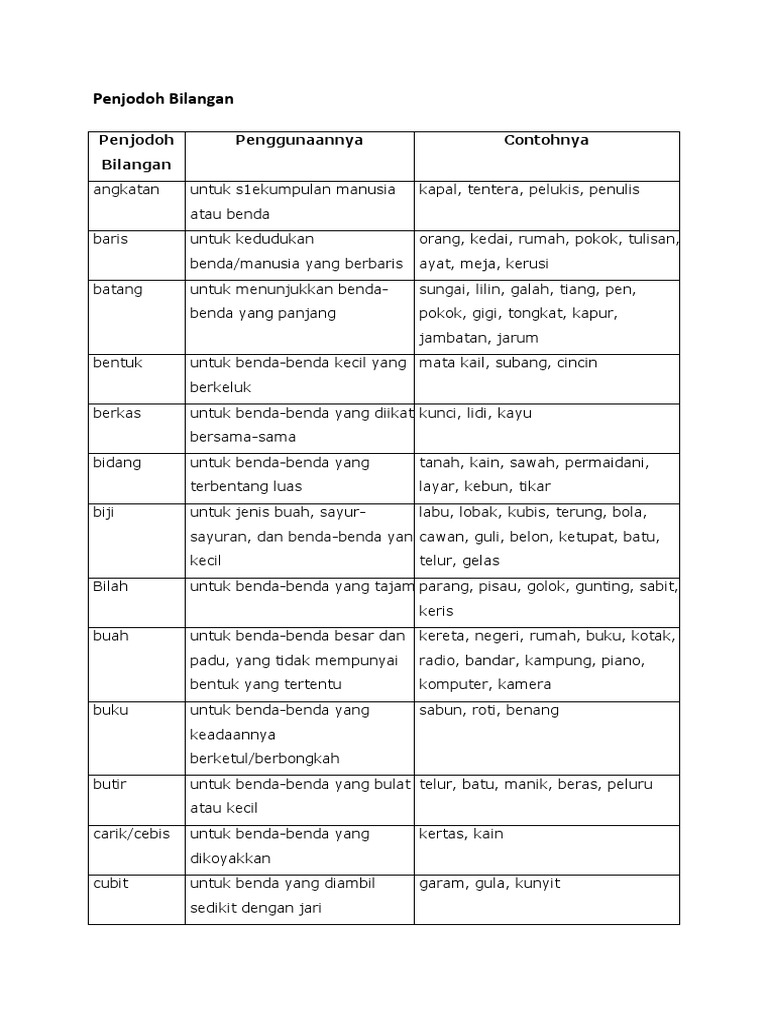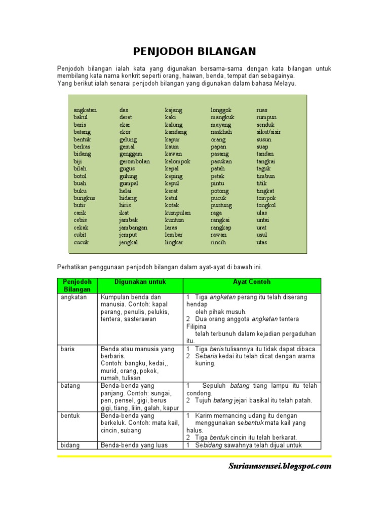 Senarai penjodoh bilangan, penggunaannya, dan contohnya adalah seperti yang berikut: Penjodoh bilangan tatabahasa bahasa malaysia/ bahasa melayu. Penjodoh bilangan interactive activity for tahun 1. Penjodoh bilangan 量词 penjodoh bilangan 量词 angkatan 队. Serumpun serai, setandan buah kelapa.
