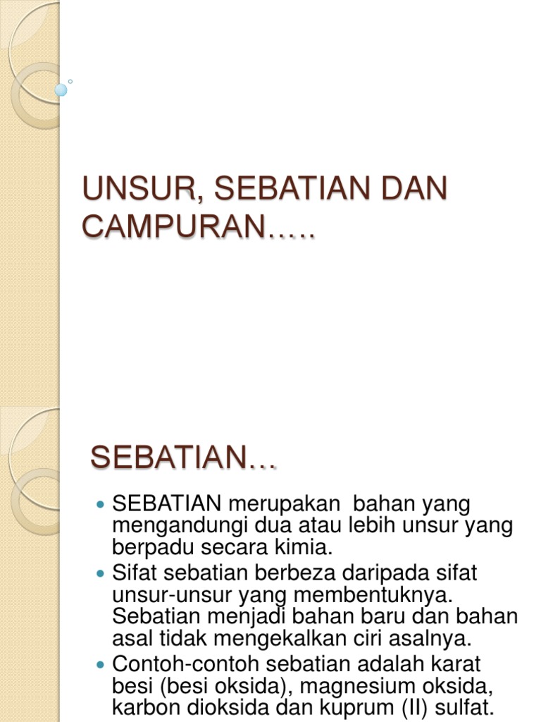 Unsur Sebatian Dan Campuran : Zat tunggal dibedakan atas unsur dan senyawa.